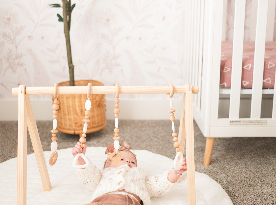 Solution: Try creating a quiet, focused space for standing practice. Set up a little area where there are fewer distractions. Consider adding the Poppyseed Baby Gym, whose hanging toys can encourage them to stand while they focus on reaching and playing. Keeping the environment calm and simple can help them concentrate on standing without being pulled in every direction by distractions.